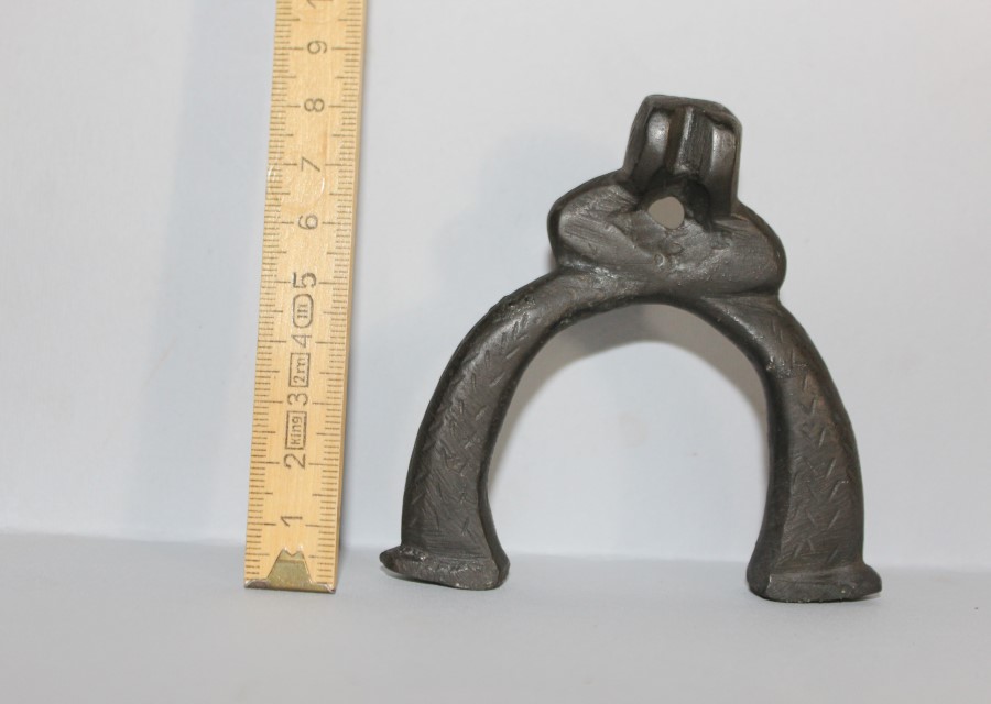 Manico in bronzo a forma di U con appendice centrale con forellino passante, decorato a tacche. Sul rigonfiamento sopra il foro ci sono due scanalature simmetriche certamente legate al passaggio di un cavetto.