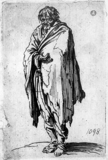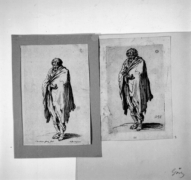L'incisione in esame e la 1098bis sono prove diverse (con diverse matrici) del medesimo soggetto e riproducono in controparte quella appartenente a una delle più popolari e riprodotte serie di Jacques Callot, Les gueux (o Les barons; Les baronis) composta da 25 tavole. L'artista ne aveva eseguito parte dei disegni alla fine del suo soggiorno fiorentino, ma incise le lastre a Nancy intorno al 1622-1623.