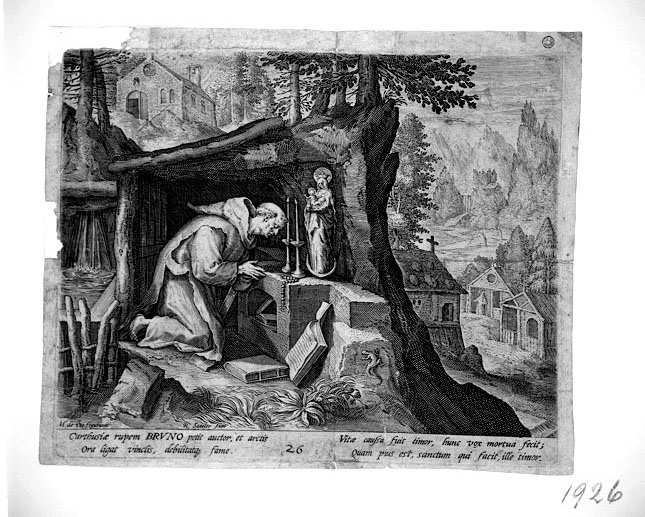 in basso sotto il campo figurato: Carthusiae rupem BRVNO petit auctor, et arctis/ Ora ligat vinclis, debilitatque fame./ Vitae caussa fuit timor, hunc vox mortua fecit;/ Quam pius est, sanctum qui facit, ille timor