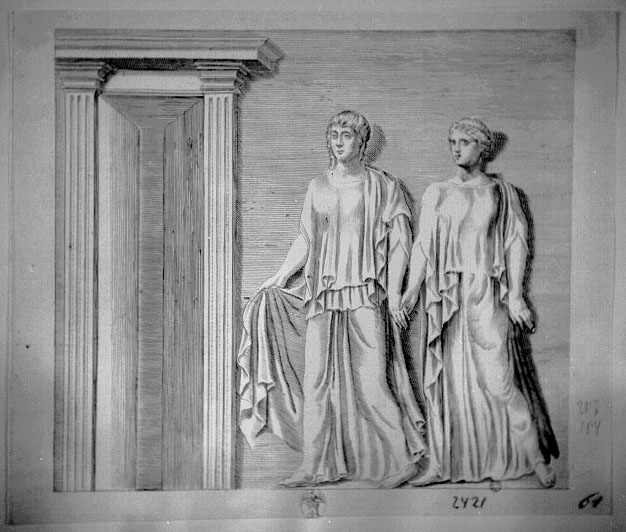 L'incisione fa parte della Galleria Giustiniana, una raccolta di 330 tavole incise divise in due volumi che riproducono parte della raccolta di antichità del marchese Vincenzo Giustiniani (Chio 1564-Roma 1637), iniziata dai primi del Seicento. Nel primo volume sono riprodotte statue di divinità, eroi e viri illustres; nel secondo, busti o ritratti, teste ideali, erme di filosofi e divinità, rilievi, sarcofagi e are.