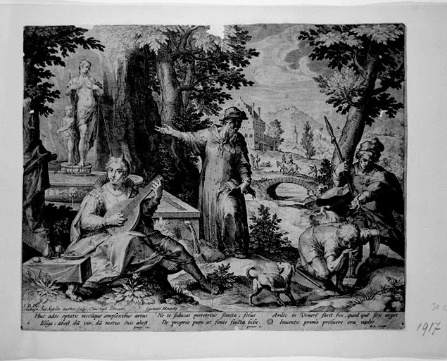 Sulla sinistra della stampa si vede una fontana, nella quale si trova una statua di Venere e Amore. L'acqua sgorga dal seno della dea ed esce dalla vasca dando origine a un piccolo ruscello. Quest’ultimo passa sotto il corpo di una cortigiana che suona un liuto, seduta sulla sinistra, alla quale possono essere riferite le parole del primo dei tre distici latini incisi ai piedi della stampa, che invitano all’unione carnale approfittando dell’assenza del marito (parafrasi di Proverbi VII, 19). Un cane che urina, visibile al centro della composizione, contamina l’acqua che viene poi bevuta da un pastore, posto sulla destra. All’uomo con la lancia alle spalle del giovane, al quale si rivolge il suo gesto, possono essere riferite le parole del terzo distico che avvertono che chi arde per Venere è come colui che si disseta con la prima cosa che trova. Al vecchio in secondo piano al centro, che indica la fontana e tiene in mano un libro, andrebbe infine riferito il distico centrale, che invita a non farsi sedurre dalle lusinghe delle prostitute e a bere solo da una fonte pura.