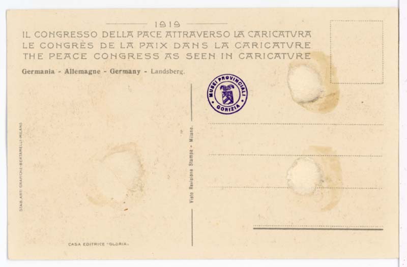 verso, in alto: 1919 / IL CONGRESSO DELLA PACE ATTRAVERSO LA CARICATVRA / LE CONGRÈS DE LA PAIX DANS LA CARICATVRE / THE PEACE CONGRESS AS SEEN IN CARICATVRE // Germania - Allemagne - Germany - Landsberg.