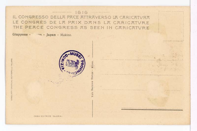 verso, in alto: 1919 / IL CONGRESSO DELLA PACE ATTRAVERSO LA CARICATVRA / LE CONGRÈS DE LA PAIX DANS LA CARICATVRE / THE PEACE CONGRESS AS SEEN IN CARICATVRE // Giappone - [Jap]on - japan - Makino.
