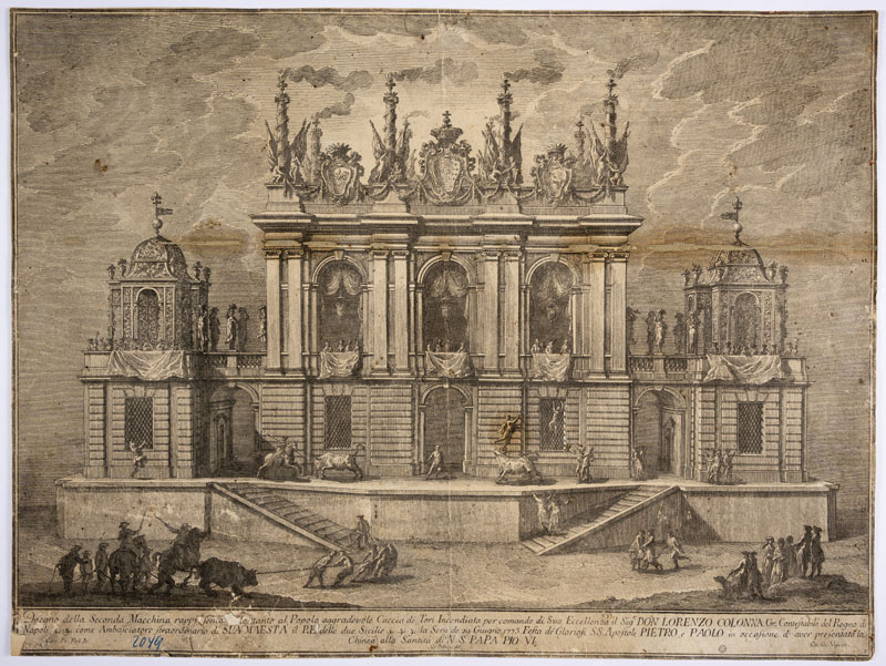 in basso al centro: Disegno della Seconda Macchina rappr[.]senta[…] la tanto al Popolo aggradevole Caccia de’ Tori. Incendiata per comando di Sua Eccellenza il Sig.r DON LORENZO COLONNA Gr. Contestabile del Regno di / Napoli &c. &c. come Ambasciatore straordinario di SUA MAESTA’ il RE delle sue Sicilie &c. &c. &c. la Sera de 29 Giugno 1775 Festa de’ Gloriosi SS. Apostoli PIETRO e PAOLO in occasione d’aver presentata la / Chinea alla Santità di N.S. PAPA PIO VI