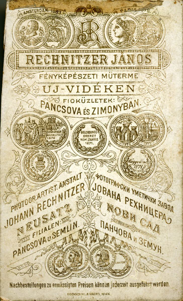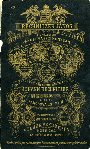 Rechnitzer Jànos/ Joh Rechnitzer/ Neusatz/ Uj-Vidéken/ Exposition Universelle Paris 1878/ Berlobunos Dekret Vdm Jahre 1871/ Nachbestellungen zu Ermassigten Preisen/ Konnen Jederzeit Ausgefuhrt Werden
