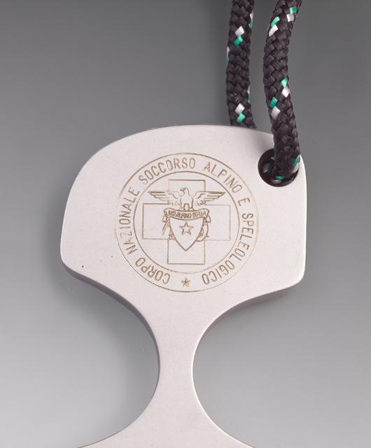 Il marchio è dato da una corona circolare all'interno della quale vi è la scritta #CORPO NAZIONALE SOCCORSO ALPINO E SPELEOLOGICO#. La testa e la coda della scritta sono separate da una stella. Nell'area delimitata dalla corona circolare vi è una croce greca, di fondo, a cui si sovrappongono uno scudo, con una stella al centro, ai lati del quale spuntano una piccozza (a sinistra) e della corda (a destra). La parte superiore dello scudo è delimitata da una fascia con scritto #CLUB ALPINO ITALIANO# al di sopra della quale campeggia un'aquila con le ali spiegate.